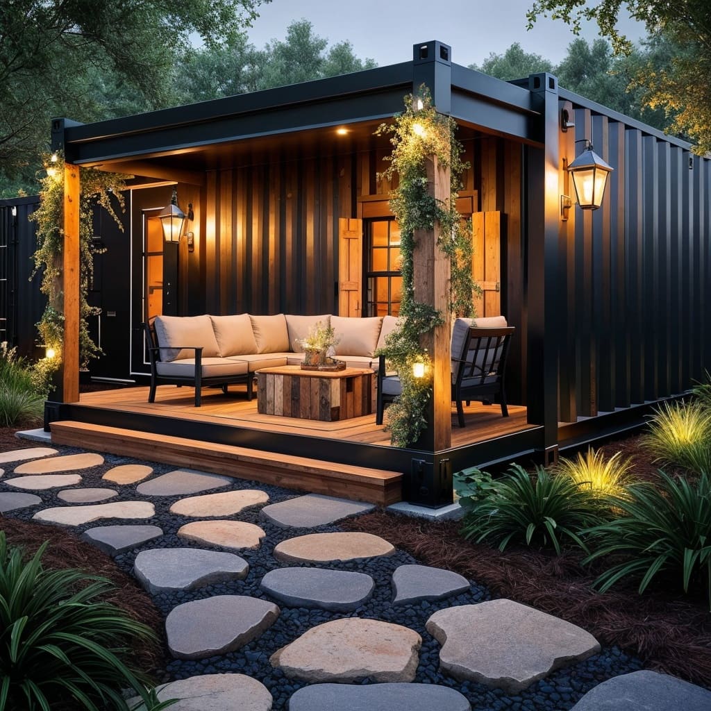 Loved this rendition of our container home with a stone path walkway. The front porch really makes the design usable. Love it! #ContainerHome #Container #Ideas #OffGridLife #OffGridLiving